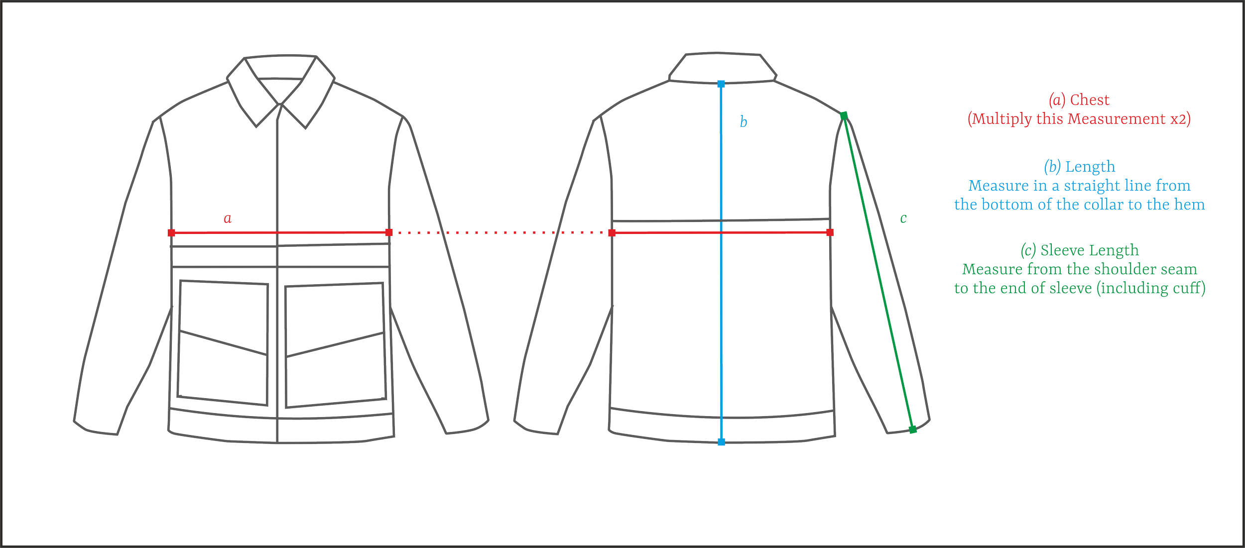 Use the diagram below to see how we measure our garments. You can also use these measurements to compare with a garment you already own.